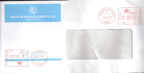 Carta circulada do Porto (Pereiró) a 2013/04/05 com o novo valor do tarifário para correio normal nacional (€0,36) com a curiosidade de ter havido um erro na impressão da 1ª franquia, com valor 00.00, e a carta deve ter entrado novamente na máquina, pelo outro lado para ser validada a franquia impressa. Máquina tipo Neopost