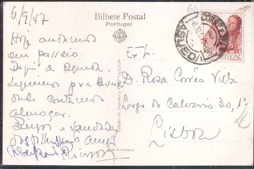 Postal do Souto do Rio - Águeda, circulado em setembro de 1947 de Águeda para Lisboa, com marca de dia do tipo 1928. Postal de edição da Pensão e Café Santos (Águeda). Postal com cliché da Foto Beleza do Porto